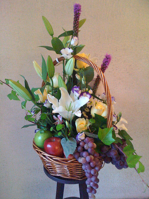 La cesta está compuesta por flores cortadas combinadas artísticamente con frutas de temporada de calidad superior para su consumo.