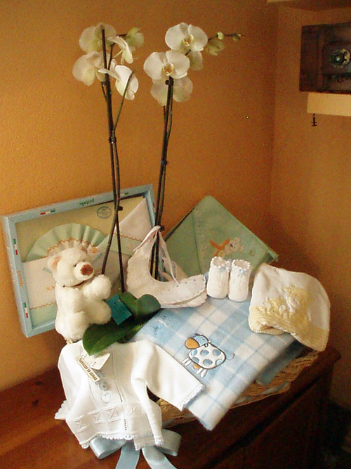 Cuenta con una planta de orquídea de dos ramas y numerosos artículos para el recién nacido.